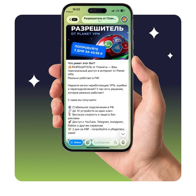 - Запустите нашего бота в Telegram @Planet_Vpn_Key_Bot